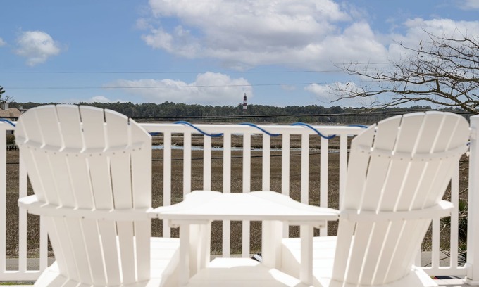 Wandering upstairs, you’ll find more ‘East Side Breezes’ to love. The 2nd Living Area has comfy furnishings, another Flat Screen Streaming TV, and access to the enormous Waterfront Deck overlooking the Assateague Channel and Lighthouse. Fully furnished, it’s a great place to enjoy dinner Al-Fresco Style, or catch some rays.