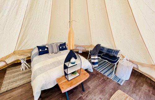 Luxury Lakeside Canvas Bell Tents at Lakeview Events, AB. Located an hour and a half outside of Edmonton along Peanut Lake. There are five canvas bell tents on site, perfect for group bookings, bachelorettes and family reunions.