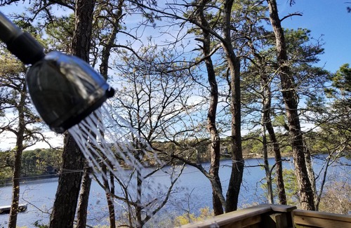 Our cottage has all the conveniences of home (and then some) in a lovely Cape setting. Rinse off or clean up in our new outside shower while overlooking the pond.