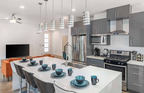 Looking for an Austin home that's big enough for your whole crew to stay? Look no further! This beautiful 6-bedroom home can host up to 21 people at a time, and there's plenty of space for everyone! The spacious open concept design makes the living area group-friendly, and there's a billiards table and a large Smart TV for your entertainment. The fully equipped kitchen has stainless steel appliances, plenty of countertop space, and loads of cupboards to hold all your snacks. There's everything you need to prepare and serve a great meal, and you can add BBQ to the menu thanks to your outdoor grill. A large shared outside entertainment area on the 1st-floor has long picnic tables with plenty of chairs for your group's outdoor activities, including dinner, drinks, and BBQ on the grill. There's an outdoor hot tub that is shared with the other half of the duplex that you may use. There’s also a private rooftop deck that you have exclusive access to, through the loft bedroom.