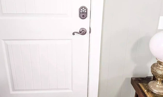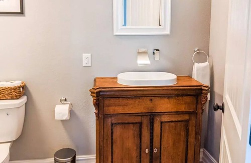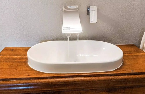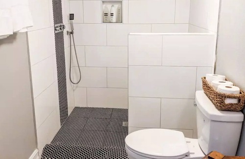 This guest suite has a comfortable living room with a small couch, a desk, a TV with Amazon Fire, high speed internet and a kitchenette. An adorable retro mini-fridge, a keurig, and a microwave mean that you can prep a quick bite while you get some work done. The star of the suite is the bathroom with its custom tile work designed by the owner of the property.