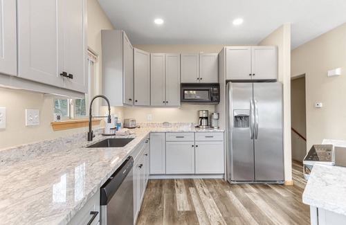 Welcome to Mountain Escape! Nestled in the heart of the Rocky Mountains, this charming duplex sleeps like a single-family home and provides an ideal retreat for nature enthusiasts and adventure seekers alike. As you step inside, you'll immediately be captivated by the spacious living area which features large windows that flood the space with natural light, allowing you to soak in the beauty of the surrounding landscape. The cozy fireplace invites you to curl up with a good book or gather with loved ones for a memorable evening. Enjoy your private indoor hot tub room after a day on the slopes or hike. There is also a great room for the kids to watch TV or play games without disturbing the others in the main living room. The kitchen is a chef's dream, boasting modern appliances, ample counter space, and all the necessary utensils to whip up delicious meals. The property offers four comfortable bedrooms, each thoughtfully furnished with plush beds and tasteful decor. Don't miss the opportunity to experience the best of Silverthorne from the comfort of this exceptional rental property. Book your stay today and create memories that will last a lifetime.
