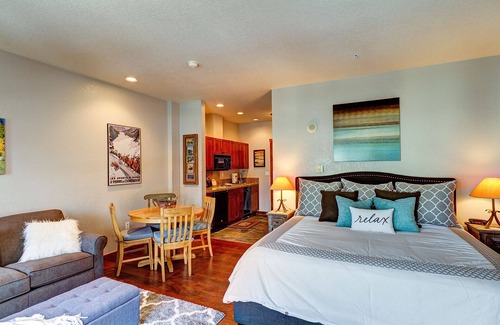 Deluxe studio, renovated Main Street Station Condo directly above the Blue River with small deck, and walk to everything in Breckenridge. 1/2 block to the Peak 9 Ski Lift, mountain views, garage parking and right on Historic Victorian Main Street. Spacious and cozy studio of 510 square feet and newly renovated with gas fireplace and free wifi. Leave your car and walk everywhere to shops & restaurants. Includes comfy king bed and queen sleeper sofa, living & dining areas, efficiency kitchen, large bathroom with tub/shower combo and 2 sinks.
