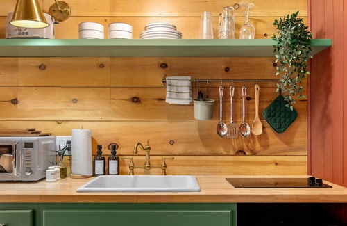 Motel-style studio beside the main house, newly renovated with a Helix queen hospitality mattress and a 50" Smart TV. The kitchenette runs along the back wall—mini-fridge, two-burner electric cooktop, microwave, toaster, drip coffee maker, dishes/utensils—and a counter with barstools for dining. Full bath with tub/shower, towels, and toiletries. Heated year-round with window A/C for summer. A clean, efficient stay for two (and pets), steps from outdoor gathering areas.