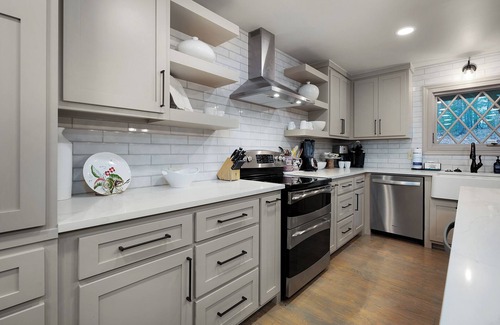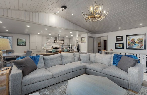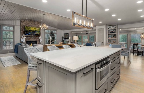 Welcome to Echoes on the Lake, a stunning retreat on the shores of Lake Blue Ridge where comfort and style meet in perfect harmony. Step into the entry-level foyer and immediately feel at home as you make your way into the warm and inviting living room, featuring a plush sectional sofa, two cozy armchairs, a stone-stacked wood-burning fireplace, and a 65" TV for evenings spent unwinding with family and friends. The fully stocked kitchen, complete with top-of-the-line appliances, a double oven, and ample seating at the kitchen island, flows seamlessly into the dining area with room for six to gather and share meals.