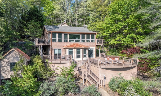 Just beyond, the sunroom offers a serene space with a breakfast table for four, a cozy sofa, two lounge chairs, and a reading nook with picturesque views of the surrounding trees and lake, leading directly to the upper deck where a gas grill and bistro table await for morning coffee or evening cookouts. Spiral stairs take you to the lower deck where relaxation continues, whether lounging in one of the four chaise chairs or soaking in the 8-person hot tub under the stars.