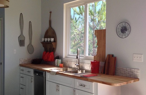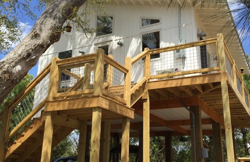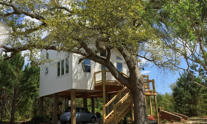 Nestled in a live oak, this one bedroom/one bath home is perfect for a "couples getaway" on a quiet wooded lot only 2 blocks from the beach. 15' in the air and surrounded by windows, you'll see birds, butterflies, and hummingbirds as they sing and feed on the nectar in the garden below! The beach is protected by barrier islands and fed by the Jordan River so it is nutrient rich (great for fishing and birding) and much more like a bay. Our garden is a work in progress with native longleaf pines, coastal prairie field, and various herbs for cocktails. You'll be relaxing in the summer breeze in no time! Please note this an ADULT ONLY (2 adults max) and absolutely NO PETS due to severe allergies and our effort to maintain the natural wildlife which you rarely see in an urban environment,. Not adhering to these rules will result in an automatic loss of deposit. Please confirm these when booking! Check IN 4pm - Check OUT NOON. We are happy to accommodate earlier/later if we can, but you will need prior approval.