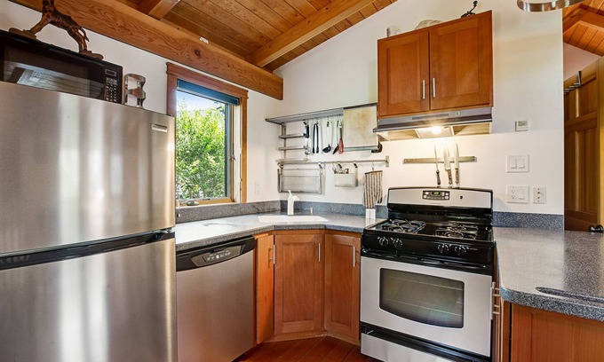 Your stay begins in the main house, where large windows and details of natural wood wait at every turn. It's a beautiful space to entertain, offering a light-filled living room with a TV and DVD player with a selection of DVDs and an HDMI cable for your laptop, a well-equipped kitchen with stainless steel appliances, and even a piano, a guitar, puzzles, and board games for fun-filled nights at home. A dedicated office, high-speed WiFi, and a home gym with fitness equipment and a smart TV are also provided.