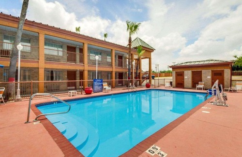 The Econo Lodge Inn & Suites Eagle Pass is located at the intersection of Highwa 57 and North Veterans Blvd, offering easy access to unique shopping, great dining and a variety of outdoor activities. This Eagle Pass, TX hotel is convenient to Mall De Las Aguilas, The International Center for Trade and Kickapoo Lucky Eagle Casino, which is just outside city limits. All guest rooms offer a flat-screen television, microwave, refrigerator and coffee maker. Some rooms feature desk, hair dryer and sofa sleeper. Poolside rooms with a beautiful view of the outdoor swimming pool surrounded by palm trees are available. Guests are welcome to get work done in the business center. There is one meeting room, with the hotel able to serve 35 people for conferences. This is a nonsmoking hotel.