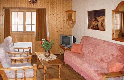 3-room chalet 45 m2. Rustic and cosy furnishings: living/sleeping room with 2 fold-away beds, dining table and cable TV (flat screen). 2 rooms, each room with 2 beds. Open kitchen (3 hot plates, oven, electric coffee machine, fondue Set (cheese)). Shower/WC. Electric heating. Carpet. Patio. Terrace furniture. Reserved parking (1 car) at the house. Maximum 1 pet/ dog allowed.