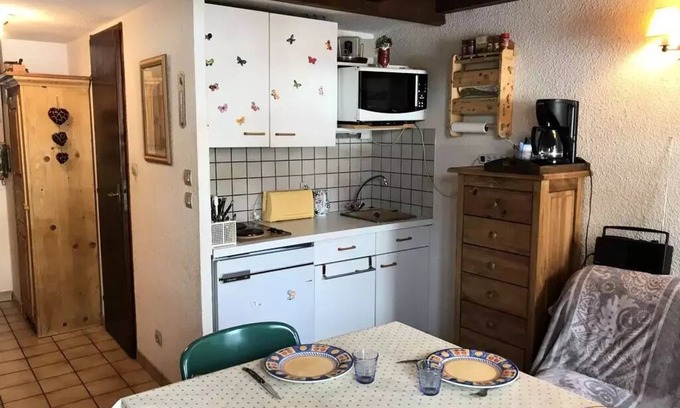 Details: Near airport : Lyon Saint-Exupéry Airport #LYS (173.1 km), Turin Airport #TRN (135.9 km), Geneva Cointrin International Airport #GVA (70.2 km) Deposit (in euros) : 300 Surface (m²) : 19 Microwave oven Car park Television Balcony Number of pieces : 1 Number of double bed : 1 Number of single beds : 2 Ski locker Distance Tracks : 4300 metres Distance Ski School : 3200 metres Floor Number of bedrooms Number of cabins Number of toilets Number of bathroom : 1 Exposure : West Cooked : 1 Heating : 1 Washing machine Fridge Oven Smoke detector Dishes and cutlery : 1 Number of stars : Unclassified Elevator : 1 Toaster