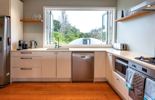 The modern kitchen at this Onetangi Beach accommodation comes equipped with all the mod cons you need for a fabulous stay, while the sun-soaked open-plan living space is the perfect place to relax come rain or shine. Slide open the bi-folding doors and catch a glimpse of the ocean as you enjoy a morning coffee on the deck, the perfect way to start your Waiheke day!