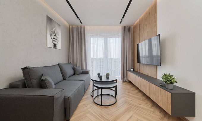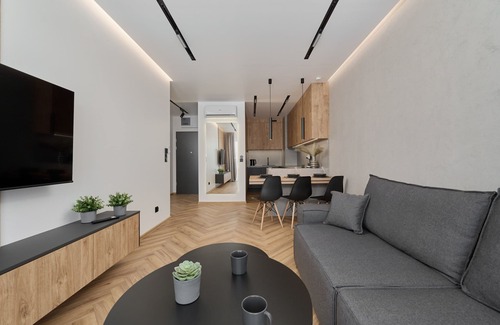 Air-conditioned apartment with balcony arranged for 4 people will be perfect for a family stay in Wroclaw! The living area offers access to a furnished balcony where you can enjoy your morning cup of coffee. There are Smart TVs in the living room and bedroom, as well as free Wi-Fi. The bedroom also features a beautiful dressing table that can function as a remote workspace. The kitchenette contains all the necessary kitchen appliances and tableware for cooking and serving meals. There you will find an induction cooktop, refrigerator, freezer, microwave-oven, dishwasher, as well as all the necessary dishes, pots and cutlery. The bathroom is equipped with a walk-in shower and a washer-dryer, making the apartment ideal for a longer stay. A complimentary set of toiletries (soap, shampoo and shower gel), towels and linens are provided to help start each stay. In addition, travelers with pets are welcome here - the apartment is pet-friendly. The interior of the property is functionally designed, meeting all the needs of guests. The space is decorated in a modern yet cozy style. Illuminated mirrors and led lighting with adjustable intensity of illumination in each room, make it a unique atmosphere.