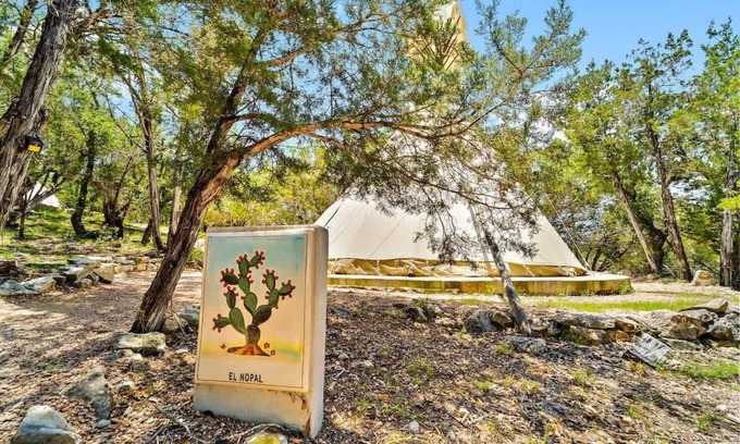 El Nopal | Pet-Friendly Tipi + Pool Access is located in Dripping Springs. El Nopal | Pet-Friendly Tipi + Pool Access provides accommodation, featuring Kitchen, Air Conditioner, Pet Friendly, among other amenities. This House features Kitchen, Air Conditioner, Pet Friendly, to make your stay a comfortable one.