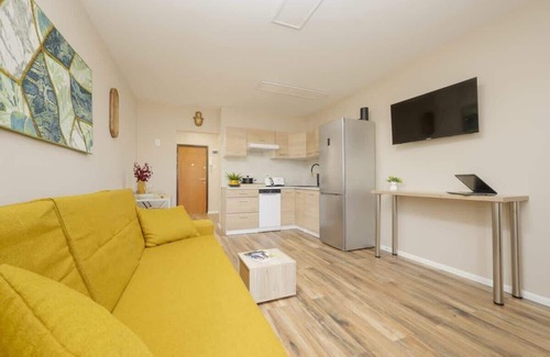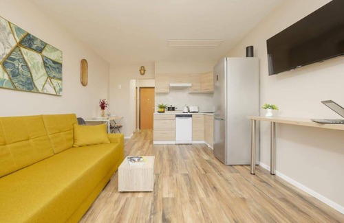 The cosy studio flat, with an area of 25 m², can accommodate 2 people. It will be a perfect choice for a romantic trip to Warsaw or for a business trip. Its space is filled with light colours and wood elements, and is complemented by trendy yellow accessories. Its unique décor creates a pleasant atmosphere and will make our guests feel special. The flat consists of a living room, a kitchenette, a balcony and a bathroom. Its multimedia equipment includes a modern TV with SmartTV function and WIFI internet access. The spacious living room is equipped with a comfortable sofa bed, a desk, a chest of drawers and a TV. There is also a table with chairs, where our guests will be able to comfortably eat meals together and have a good time. The modern kitchenette is fully equipped with all necessary utensils for preparing meals. Numerous amenities are available, such as a fridge with freezer, dishwasher, tea and coffee making facilities and a microwave oven. The cosy bathroom has a shower, hairdryer, towels and toiletries. The balcony offers a beautiful view of Warsaw from the eighth floor, where the studio is located. The flat will be the perfect buoyancy for an overnight stay in Warsaw, and the time spent here will certainly be unforgettable.