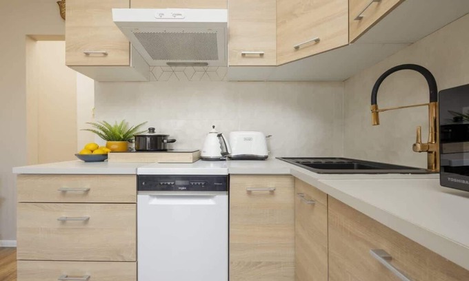 Dishwasher, kettle, set of kitchen and tableware, fridge, tea and coffee making facilities