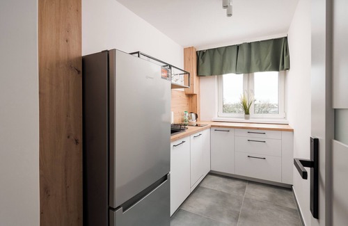 Elbląska Modern Apartment offers a stylishly decorated living room with a sofa bed, a bedroom with a comfortable double bed, a kitchen, a bathroom, and a balcony. Guests have access to a range of practical amenities, including free Wi-Fi, a TV, an iron, a hairdryer, a washing machine, a dishwasher, an induction stove, a refrigerator with a freezer, a toaster, a kettle, and kitchen accessories. Guests can also use the public parking outside the building, although parking spots are not guaranteed.