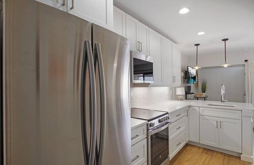 The kitchen was fully renovated and features new stainless appliances and large counter tops. The brand-new kitchen features an electric stove, an oven, a microwave, a refrigerator, pots, pans, coffee maker, toaster (no dishwasher).