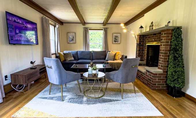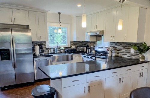 The first floor features stylish living room with fireplace, half bath, and a modernized kitchen; The second floor includes 1 king size master suite with private bathroom, kids room with 2 twin sized beds, Pack N' Play, another full bathroom, and 2 more bedrooms furnished with king and queen beds. 3 extra floor mattresses and a sofa for sleeping up to 12 people!