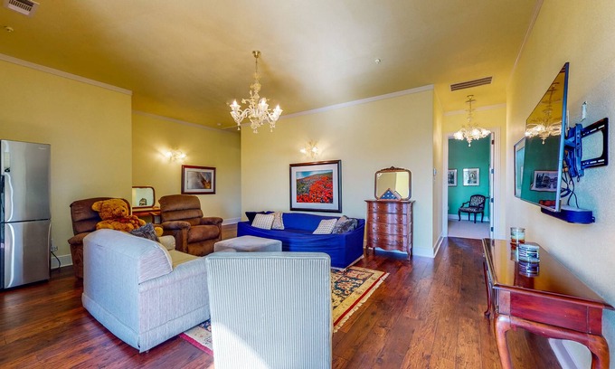 At home, a welcoming living area features ample seating and a large TV - inviting you to kick back and unwind into vacation mode. There’s also a full fridge, microwave, and coffee maker. (This apartment does not have a kitchen.)