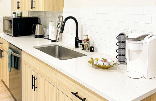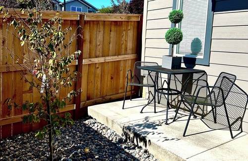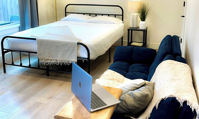 Cozy Modern Studio with private patio . This stylish retreat offers the perfect blend of comfort and convenience. Enjoy a cozy queen bed, a charming dining area, and a fully equipped bathroom with sleek, modern finishes. The thoughtfully designed space is ideal for relaxing or working, featuring a comfy couch and a laptop-friendly setup. Located near top attractions, dining, and shopping, this studio is perfect for couples, solo travelers, or business guests seeking a serene and stylish stay.