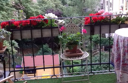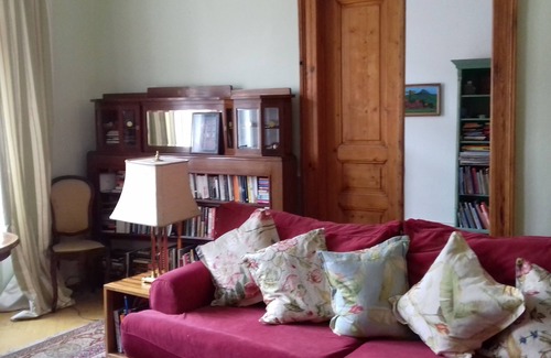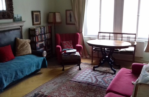 This is a smart family home, furnished with antiques and a library of books. The large sitting room with high ceiling overlooks a quiet street, and the kitchen opens onto a sunny balcony on the garden courtyard side.