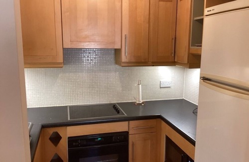 Reception room with modern feature fireplace, carpeted floor, coved ceiling and access to balcony. Fully fitted kitchen with electric oven, large fridge, microwave. Double bedroom with fitted wardrobes. Ideal for temporary stay. One bedroom + 1 full size couch. Duvet/linen available for 3 people