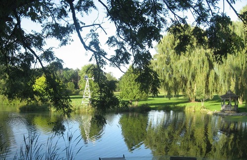 The lodge has two bedroom , one queen and one full sized bed (plus a queen hide-a-bed), a full kitchen, bathroom with shower, and a large great room which contains ample comfortable seating, a TV, piano, and a dining table that can comfortably seat 10. It is decorated with beautiful antique furniture, chandeliers, and it warmly welcomes all who enter. The fully furnished loft bedroom provides a magnificent overview of the great room below. Beautiful perennial gardens, flower beds and the pond afford a beautiful view no matter which direction you are looking. There is a porch/deck that runs the entire length of the north side of the lodge. It is equipped with comfortable outdoor furniture, a table and chairs and a gas grill. If needed, we can provide an air mattress for additional guests. The owners' home is located just down the brick path adjacent to the lodge, and will be available to assist in any way necessary.