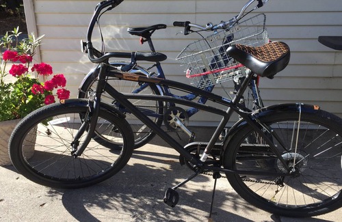 Two bikes, one with a large basket for bringing home your products from shopping the strip mall that is about a mile away.