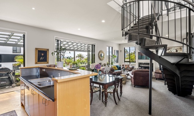 Upstairs, a large, open plan primary bedroom and living space offer million-dollar views out to Rangitoto Island and the city from a private deck and peaceful, cozy living area. Downstairs, two bedrooms, a bathroom and kitchenette facilities mean there's privacy and space for everyone - ideal for family or work groups.
