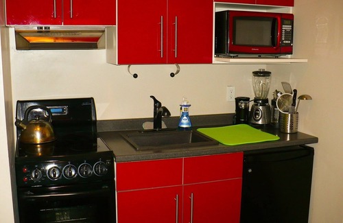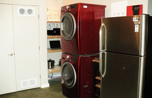 This stunning 1400 sq. ft. loft style studio features high ceilings, cement floors, lots of light, remote controlled moisture-sensing skylights, commercial ADA approved bathroom with a heated floor and tile shower, on demand hot water system for domestic and in floor heat, rooftop balcony with great views, washer and dryer, Wi-Fi, cable, piano, Italian-made Mini-kitchen by Lamborghini Roso, 2 large flat screen TVs, Bose speakers throughout the unit.