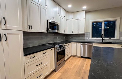 Inside, the house features central AC, a gas fireplace, and a fully equipped kitchen with all the essentials, including a dishwasher, microwave, and coffee maker. Relax in the spacious living room with a good book from the selection provided, or gather around the TV for a movie night with the family.