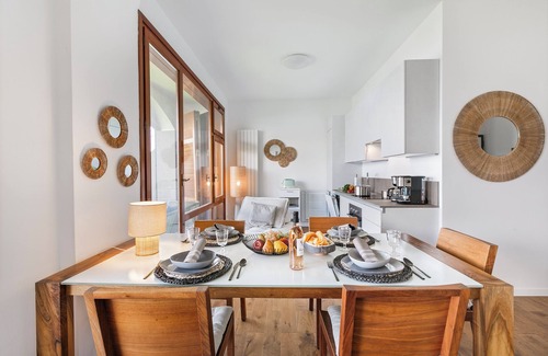 Inside, the stylish apartment benefits from a bright and spacious open-plan living room that incorporates the kitchen and is furnished with a modular L-shaped sofa, a dining table and a Smart flatscreen HDTV. The kitchen is fitted with a Nespresso coffee machine, a cooker hob, a microwave, a dishwasher and a fridge freezer.