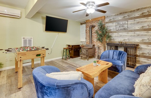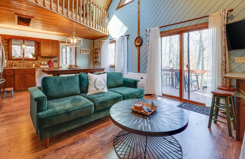 This ultra-cozy, renovated cabin is situated steps from Roamingwood Lake in the Hideout! Experience endless entertainment and relaxation with a comfy theater room, exciting game room, cozy reading loft, firepit, and more. Located in one of the most exclusive communities of the Poconos with tons of amenities. Loaded with elegant furnishings, wood accents, thoughtful touches, and air conditioning. Each bedroom is equipped with luxurious hotel-quality mattresses. You are sure to enjoy your stay!