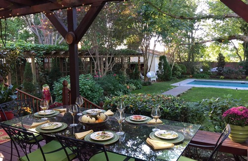 This home is perfect for family reunions. The 'Scarborough Affair' home is situated on a 17,600 square ft. triple lot, six (6) blocks from the beach. This is the ultimate in vacation privacy. The rear yard is adorned with lush landscaping, hardscape, low voltage night up-lighting, and pergolas draped with Wisteria and grape vines. The 30x15 in-ground heated pool (in season) is a fabulous retreat. In the evenings enjoy the illuminated pool (on timer) and the tranquility of the yard and gardens with added ambient lighting throughout the pergolas. The interior entertaining spaces are open, light and airy and filled with a mix of antique, designer and casual beach furnishings. The open floor plan is perfect for daily family gatherings. The first floor living space has beautiful Mahogany floors throughout, and walls of floor-to-ceiling French doors and windows overlooking the multi-level deck and rear gardens with pool.