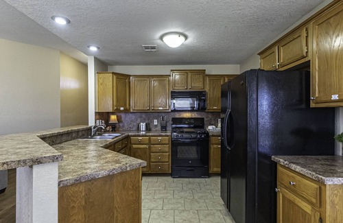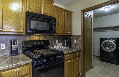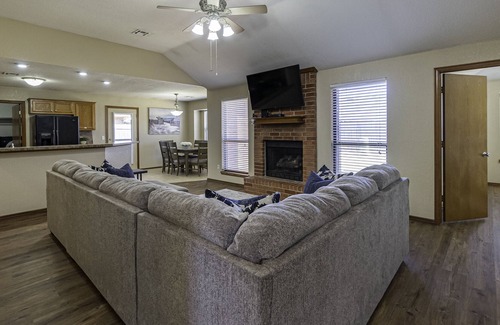 New Remodel, New Furnishings, Cozy and Private Floorplan, Spacious Rooms, Split Bedrooms, Family Friendly Neighborhood w/Sidewalks. Located near a Neighborhood Park w/Splash Pad, Playground, Picnic Tables and Pavilion. Large Dining Area w/Bay Window, New Flooring throughout, Full House Access with 2-Car Garage and 2-Car Driveway, Extensive Windows, Designer Pillow-Top Queen Mattresses in all 3 Private Bedrooms to Accommodate 6 Guests. Master Suite: Bay Window, Computer Desk for Laptop, Double Sink Vanity, Garden Tub, Shower, Huge Walk-in Closet. Fully Equipped Kitchen, Outdoor Patio Seating w/Gas Grill and Fenced Large Backyard for Entertaining, (2) Ultra HD Smart Tv's w/Cable & Netflix capability, Free Cox High Speed Internet, Storm Shelter, Washer and Dryer.