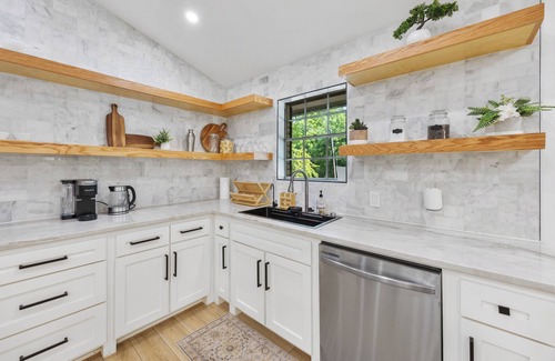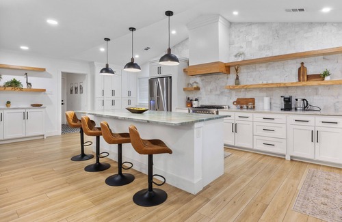 The outdoor amenities are the highlight of this retreat. Take a dip in the inviting cocktail pool, perfect for cooling off on warm Texas days. The outdoor kitchen is fully equipped.