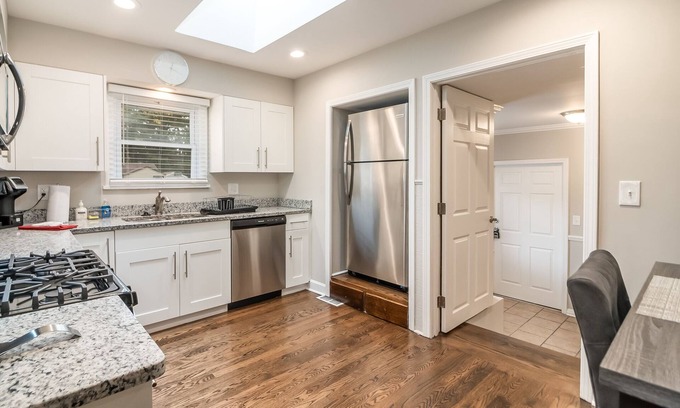 2100 SF renovated unit is 7-9 min away from interstate 90, which takes you straight to O'hare Air & downtown! This property has 4 bedrooms, & 2 full bathrooms. Master has a KING, and 3 bedrooms have a Queen. The living room has room for 1 air mattress (Total of 5 beds). Plenty of Kitchen utensils, all you need in a kitchen, including cooking spices and oils! Children friendly & lots of technology!