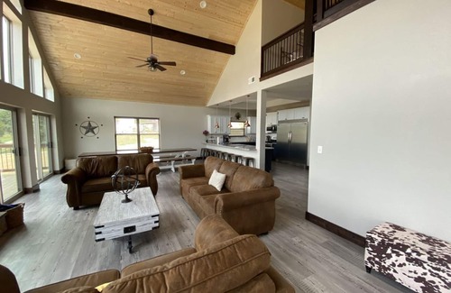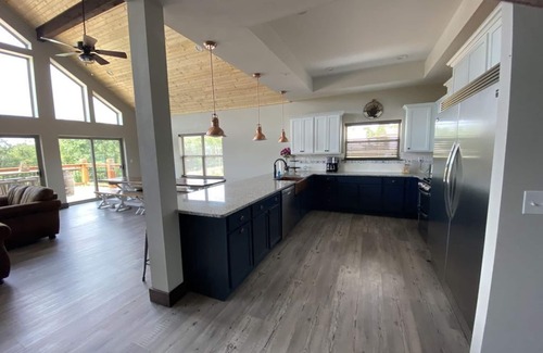 Situated in the quiet Little Indian Resort community along Table Rock Lake, Elk Lodge provides the quintessential getaway to experience a host of state parks in the area, Branson, Silver Dollar City and more! Start your morning off right by preparing a delicious breakfast for the group in either of the fully equipped kitchens (main level and downstairs) complete with stainless-steel appliances and granite countertops. The expansive main kitchen boasts a 62-inch refrigerator freezer with a full-size freezer and a gas double oven and stovetop. Make a fresh cup of coffee and indulge in your meal al fresco on the extended deck with spectacular views of Table Rock Lake. After a morning spent at the refreshing community pool, you'll love returning to the enormous interior of your new home-away-from-home, offering soaring wood-paneled ceilings, sleek luxury vinyl flooring and large wall-to-wall windows which illuminate the open-concept living area. While the adults watch a movie on the flat-screen smart TV atop an immaculate gas fireplace, the kids can disappear to the game room downstairs outfitted with a pool table, skee ball and flat-screen TV. Step outside for a night cap and warm up by the gas fireplace or wood-burning fire pit. As bedtime approaches, start your nightly routine in any one of the luxurious bedrooms where plush sleeping arrangements and a blissful night's sleep await! Kids will love the camp-lodge style beds in the bunk room with a total of 12 twin beds. Our guests love our mattresses!