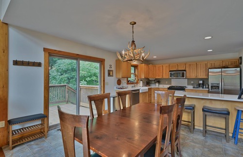 The Alce Gora Chalet is fully equipped to be your home-away-from-home. Our open kitchen is furnished with upgraded stainless steel appliances including a gourmet gas cooktop that can be used with a grill or griddle and an electric convection oven. Enjoy the brand new Kohler cast iron farmhouse sink with a Delta Touch2O faucet surrounded by massive white Quartz countertops. Savor your meals together around the dining room table, or take your experience to the wrap around deck for an epic barbecue.
