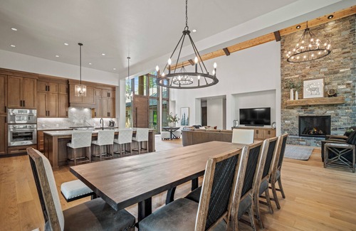 • Great Room with a stunning view of Mirror Rock Lake, twin chandeliers, sectional sofa, two recliners. It also features an 85 inch Sony flat screen TV, and Sonos sound bar. Enjoy the gas fireplace, with floor-to-ceiling rock treatment, the natural wood-beam mantle, making for the perfect blend of style and comfort