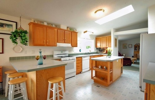 Centrally located for a variety of destinations and pursuits, this premium vacation home is spacious, comfortable, and well-maintained. Each of our residences is personally and individually decorated so you will be in a comfortable home. The spacious kitchen and breakfast bar are perfect for casual meals and the separate dining area offers views of Glacier Park mountains. The living room includes a library and the separate sitting room includes a gas fireplace. The master suite includes a large bathroom with double sinks, garden tub, and oversized shower with seating. The smaller bathroom has a tub/shower combo and single sink. The on site washer/dryer provides an extra convenience. Service is available for trash removal and exchanging towels on request.