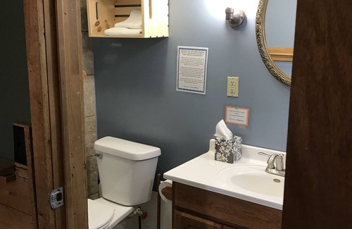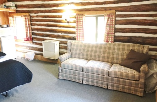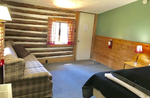 Ellis Lake Logrooms: Hemlock, Tamarack and Oak. This room is the Hemlock. This is one large log cabin divided into 3 private units. Each room has its own private entrance. The Hemlock Logroom has 1 queen bed and a queen sleeper sofa accommodating 2 adults and up to 3 small children, and a bathroom with a shower. They are similar to a small motel room. Included in your room is a dorm size refrigerator, coffee maker and microwave. This is the perfect space for those who are just traveling through or for those who do not need a kitchen for cooking. These are the most economical of all of our units as they are the smallest and located at the front of the property (If the sound of traffic is disturbing to you, we recommend that you have a look at our other cabins located further away from the road. Our Doghouse, Birch and Elm to name a few).