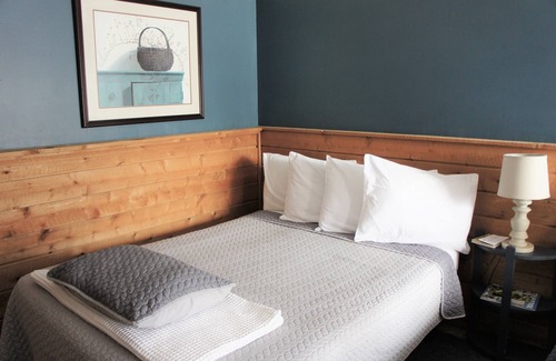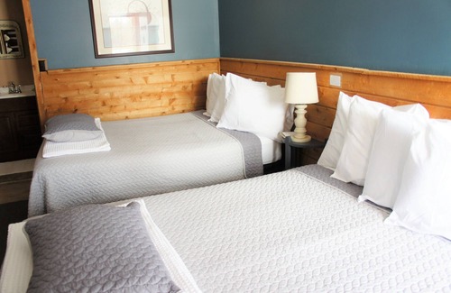 The Tamarack Logroom has 2 double sized beds accommodating 4 adults, and a bathroom with a shower. This room is similar to a small motel room. Included in your room is a dorm size refrigerator, coffee maker and microwave. This is the perfect space for those who are just traveling through or for those who do not need a kitchen for cooking. These are the most economical of all of our units as they are the smallest and located at the front of the property (If the sound of traffic is disturbing to you, we recommend that you have a look at our other cabins located further away from the road. Our Doghouse, Birch and Elm to name a few).