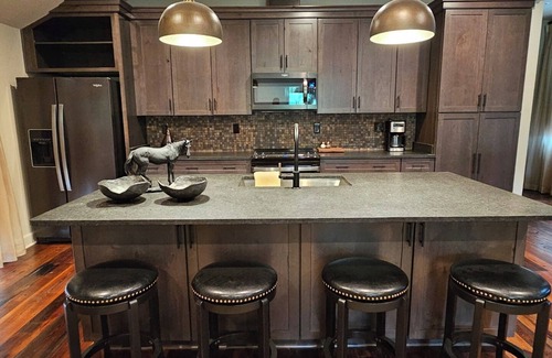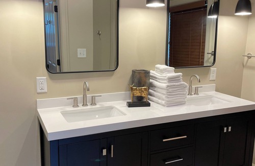 New spacious guest apartment in a separate building adjacent to a 3B/3.5B restored historic home (VRBO 3581789). The apartment features an oversized open living room/kitchen, generous bedroom with king sized bed and ensuite dual vanity shower bath, extra sleeping space offered with a fold out queen sofa bed in the living room, and a half bath and laundry adjacent to living room. The apartment sits above a three car garage and has one dedicated garage bay. The apartment is accessed via an interior staircase.
