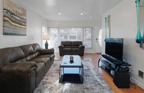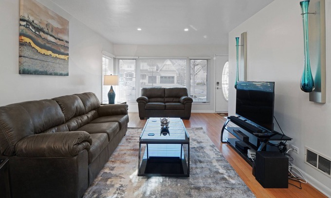 1550 SF renovated unit is 20 minutes away from O'hare Airport and 27-30 minutes from downtown Chicago! This property has 3 bedrooms, & 2.5 bathrooms. Master suite has a KING, and 2 bedrooms have a Queen. The living room has room for 1 air mattress (Total of 4 beds). Plenty of Kitchen utensils, all you need in a kitchen, including cooking spices and oils! Children friendly & lots of technology!