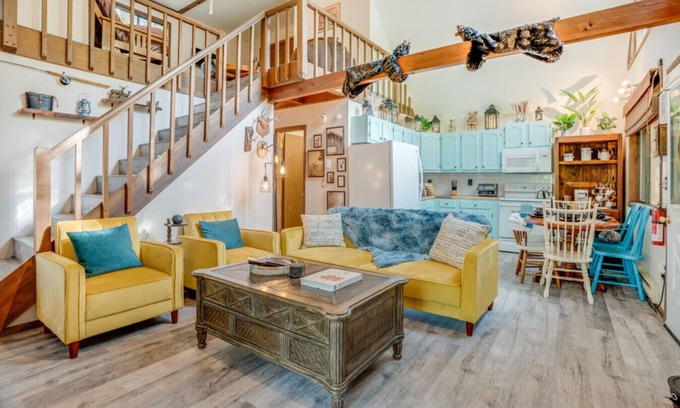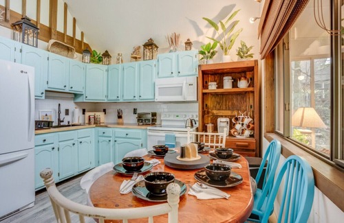 No detail was forgotten - we designed the house hoping to amaze guests with unique, vintage, mountain decor, and fully-stocked kitchen and living areas. Guests will enter the home through the screened-in porch with plenty of seating, then into the kitchen and expansive living space with a smart TV, Alexa Echo Dot, and room for everyone to hang out. The kitchen has retro flair and modern equipment.