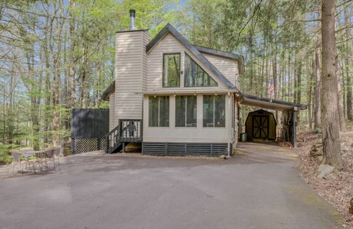 Our chalet is tucked under snowy trees on a property with a fire pit and a grill on the back deck. Relax inside with the fireplace ablaze while playing pool, or head outdoors to soak up nature with our community ski slope - perfect for your winter getaway!