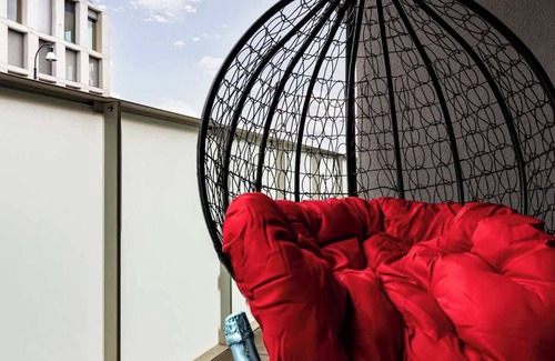 The apartment features a large, sunlit balcony with a breathtaking view of the lush, landscaped courtyard and peaceful garden — a perfect spot for morning coffee or evening relaxation.