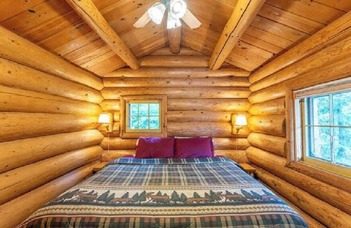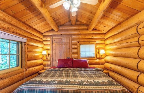 The great room features a vaulted ceiling, Northwood’s style log furniture, flat screen television with ROKU and a complete kitchen. This cabin has a full bath with a tub and shower. Each of the two bedrooms have a king bed. There is extra sleeping in the living area with a full-size futon. A small boat dock, sun deck with Adirondack chairs, picnic table, charcoal grill and campfire ring are all provided at your cabin. This cabin is rated for 4 guest sleeps up to 6. A wood fired Sauna is within walking distance from the cabin.